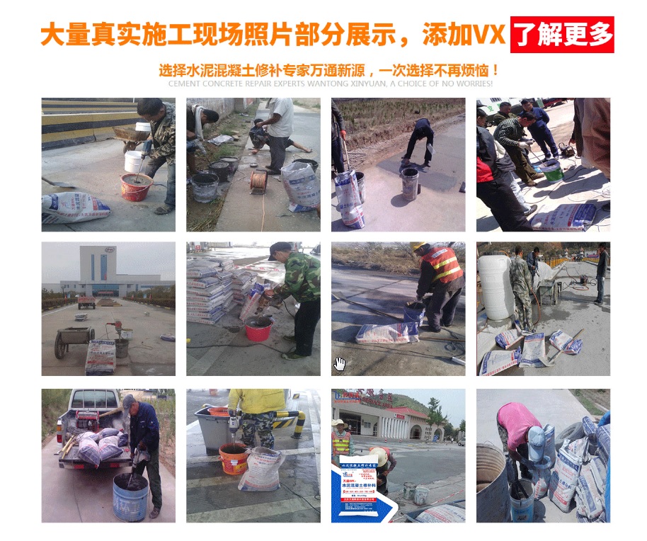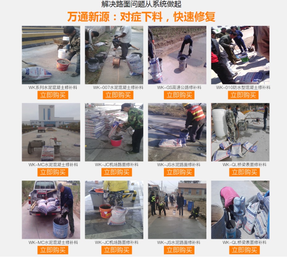 大慶萬通新源科技有限公司獨有的混凝土路面高強速補料,是水泥混凝土路面病害修復的好材料。疲勞、凍融循環(huán)、彎曲壓力、滲水和基層破壞等原因都會引起水泥路面的破損,從而帶來高昂的維護費用。與以往的剛性修補方法不同,混凝土水泥路面維修速補膠提供了一種獨特的柔性修補產(chǎn)品和技術(shù),高柔性、高抗拉性,可跨伸縮縫施工和高抗壓性使得混凝土快補產(chǎn)品為水泥混凝土路面提供了******性的修補。傳統(tǒng)的剛性修補方案,如環(huán)氧砂漿和快干水泥產(chǎn)品,由于其自身的粘結(jié)失效,抗疲勞性低以及與原路面不同的伸縮系數(shù),修補面會在短時間內(nèi)失效或產(chǎn)生新的裂縫,需要反復修補,有效期短且費用高昂。大慶萬通新源科技有限公司的混凝土水泥路面維修速補膠可以隨原路面一起伸縮,移動,從而避免了粘結(jié)失效和產(chǎn)生新裂縫。萬通快補產(chǎn)品優(yōu)異的粘結(jié)性、柔韌性和高防滑性,特別適用于水泥路面的淺層粘合修補,多邊角混凝土板層修補,跨伸縮縫修補以及路面沉陷修補。萬通混凝土病害修補料針對混凝土起皮起沙、斷板裂縫、蜂窩麻面、坑槽露石子、漏筋掉皮、橋梁的掉皮漏筋快速通車使用時間長。應(yīng)用萬通快補產(chǎn)品,施工后一天就可以恢復交通。大慶萬通新源科技有限公司的萬通水泥路面維修速補膠適用于高速公路、機場路面、農(nóng)村村村通路面、廠坪、學校操場、市區(qū)公路、小區(qū)路面、橋梁、水泥路面的修補。使用萬通特快補材料修補路面可以一勞永逸! 水泥地面起砂怎么辦,混凝土修補劑混凝土地面起砂,混凝土地面修補,地面起砂怎么辦,